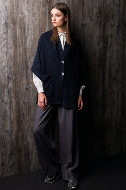 Накидка из мягкого трикотажа, застегивающаяся на две пуговицы. Спереди большие накладные карманы. Спинка укороченная до талии.