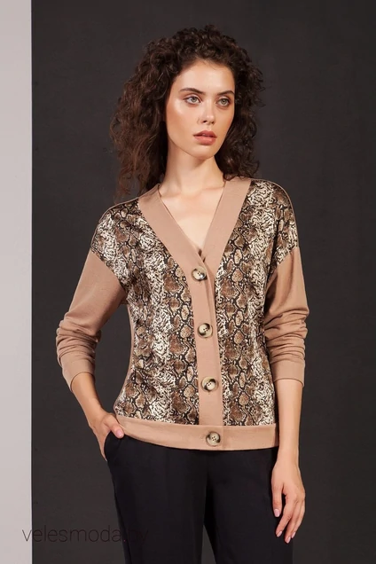 Кардиган прямого силуэта из тонкого трикотажа в сочетании с шёлковой гладкой блузочной тканью спереди. По горловине и борту широкая планка из трикотажа с застёжкой на 4 петли и пуговицы. Линия плеча спущена, рукава втачные длинные. Спинка из трикотажа. Брюки женские из костюмной ткани слегка зауженные к низу длиной до щиколотки.