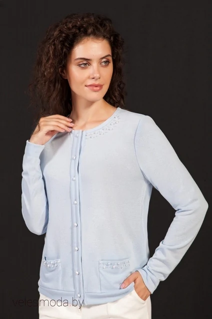 Элегантный кардиган прямого силуэта из мягкого трикотажа, застёгивающийся на 8 петель и пуговиц-бусин по притачной планке. На полочках обработаны декоративные накладные карманы украшенные бусинами и стеклярусом. Рукава втачные длинные. Горловина окантован