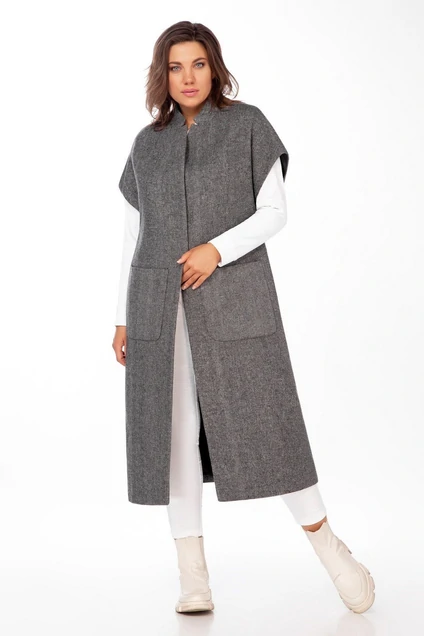 В нижней части полочек накладные карманы. На спинке хлястик. Длина изделия 120 см