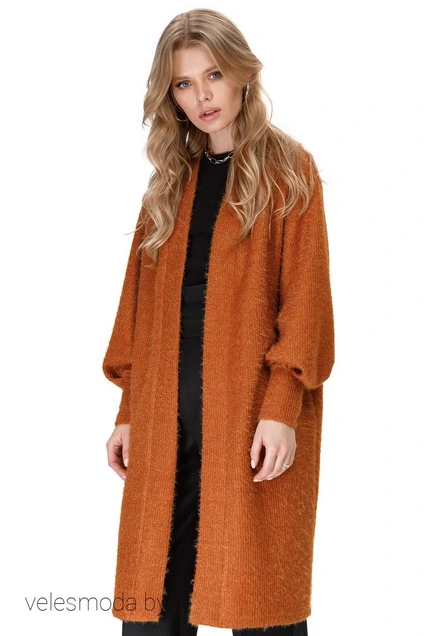 Объемный кардиган длины миди из мягкого трикотажа. Детали: свободный покрой, спущенная линия плеча, края бортов с широкими притачными планками, длинные объемные рукава с притачными манжетами и заложенными складками по низу, без застежки, съемный пояс