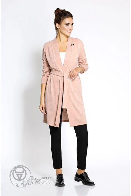 Кардиган из трикотажного полотна. Детали: прямой силуэт, спущенная линия плеча, борта обработаны притачной планкой, съемный пояс, съемное украшение брошь. Длина по спинке – 90 см.