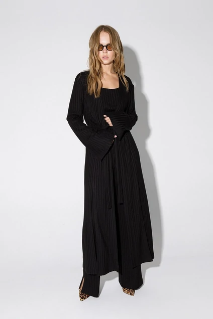 Кардиган с высокими разрезами из мягкого трикотажа-лапша. Детали: прямой силуэт, спущенная линия плеча, рельефы переда и спинки, втачные длинные рукава с разрезами по низу, кулиса, съемный пояс, кардиган без застежки