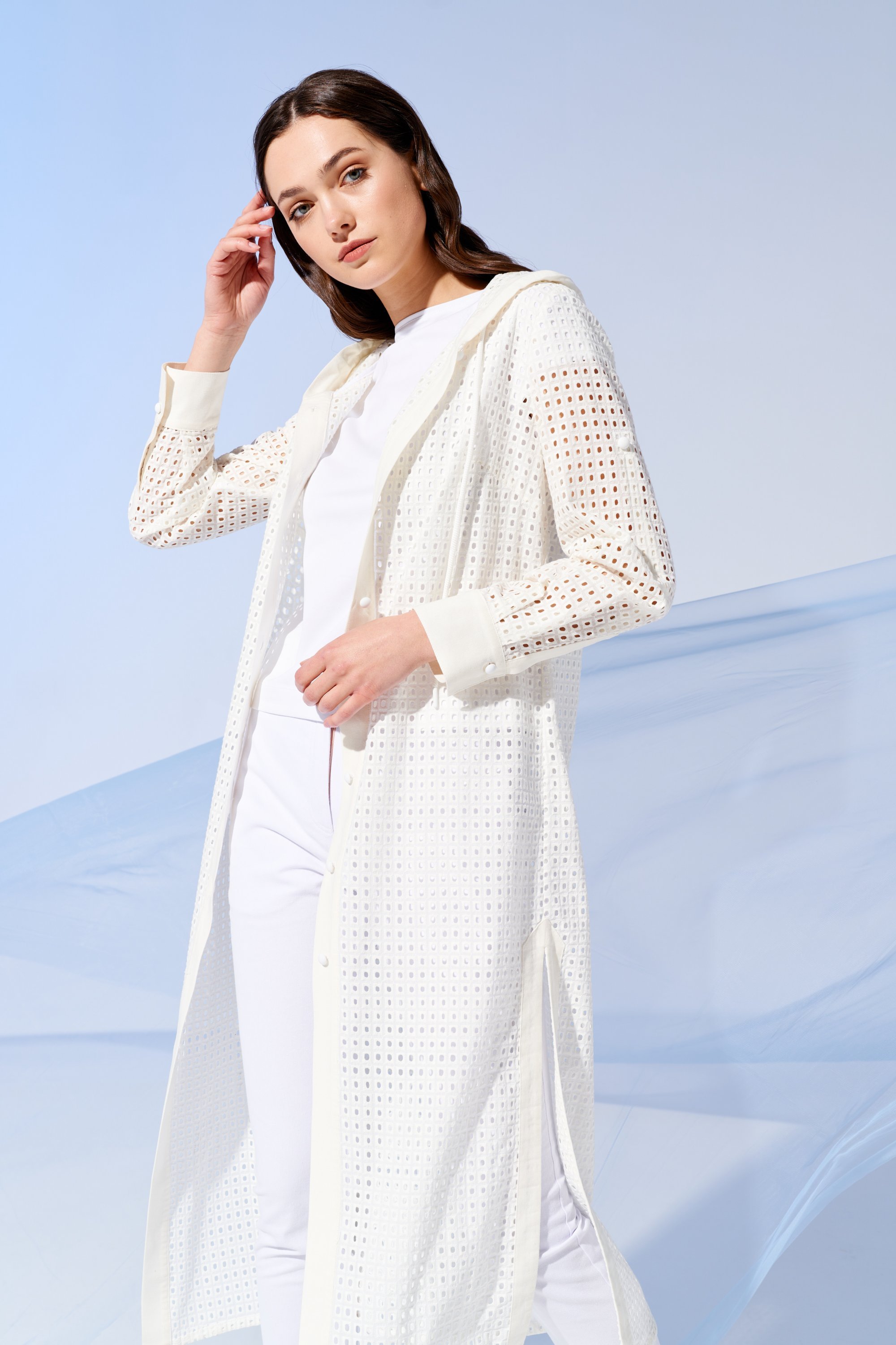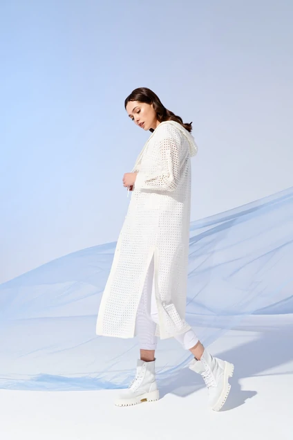 Стильный хлопковый кардиган с капюшоном, по бокам разрезы. Застежка на пуговицы. Планка, разрезы и манжеты кардигана отделаны широкой льняной бейкой.