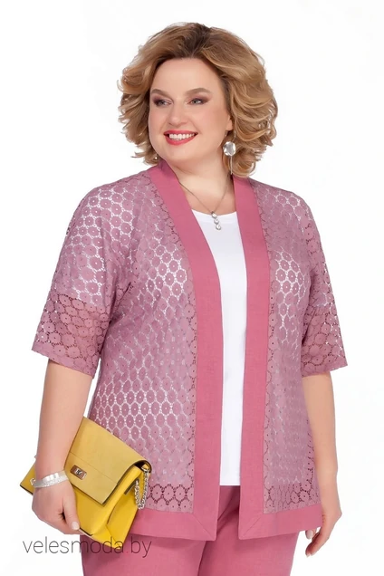 Накидка прямого силуэта без застежки и воротника. Выполнена из кружевного хлопкового полотна с отделкой из однотона. Рукав цельнокроенный. Край борта и низ изделия оформлен узкой притачной деталью. Длина спинки 75 см. длина рукава 35 см.