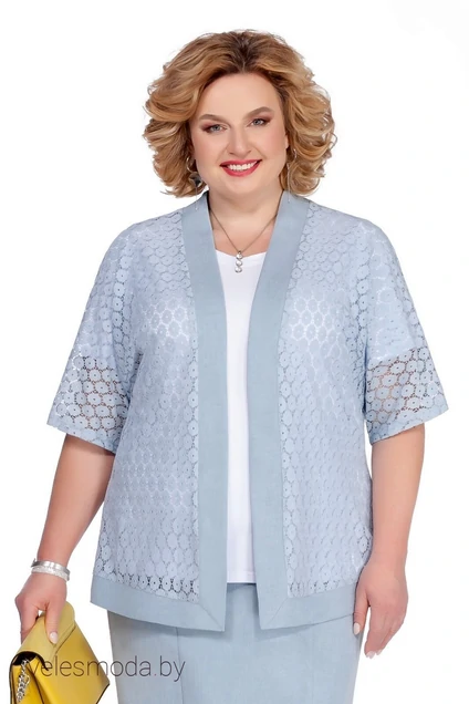 Комплект-двойка, состоящий из накидки и майки. Накидка прямого силуэта без застежки и воротника. Выполнена из кружевного хлопкового полотна с отделкой из однотона. Рукав цельнокроенный. Край борта и низ изделия оформлен узкой притачной деталью. Длина спинки 75 см. длина рукава 35 см. Майка прямого силуэта из трикотажной вискозы. Вырез горловины округлый. Рукав втачной одношовный. Длина спинки 65 см. Длина рукава 23 см.