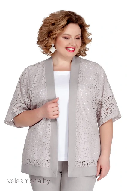 Комплект-двойка, состоящий из накидки и майки. Накидка прямого силуэта без застежки и воротника. Выполнена из кружевного хлопкового полотна с отделкой из однотона. Рукав цельнокроенный. Край борта и низ изделия оформлен узкой притачной деталью. Длина спинки 75 см. длина рукава 35 см. Майка прямого силуэта из трикотажной вискозы. Вырез горловины округлый. Рукав втачной одношовный. Длина спинки 65 см. Длина рукава 23 см.