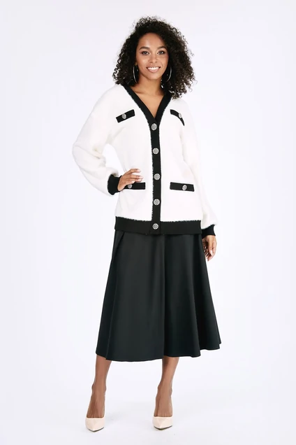Кардиган свободного силуэта с V-образны вырезом . Рукав спущеный. Центральная застежка на декоративные петли-пуговицы. Планка, листочки и манжет низа и рукава из конрастной ткани. На листочках по переду декоративные пуговицы