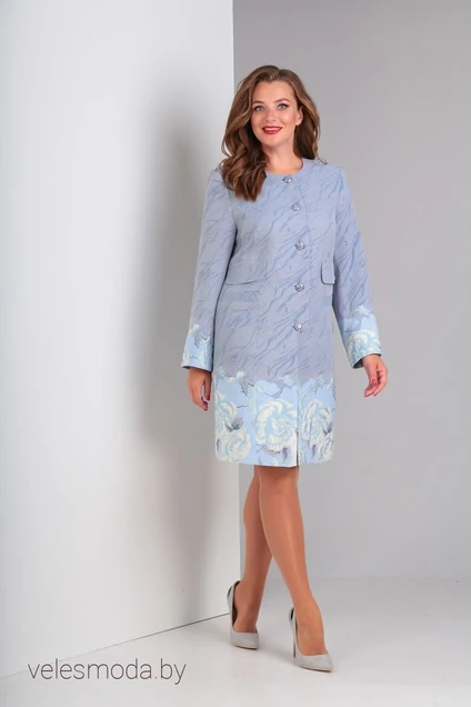 Ткань: жаккард Вырез горловины: округлый Рукав: длинный Длина рукава: 60 см. Длина изделия: 93 см. Статус модели: демисезонное Силуэт: прямой Цвета: голубой Вид застежки: центральная планка на петли-пуговицы Описание: Кардиган прямого силуэта на подкладке, без воротника, с округлым вырезом горловины. По переду кардигана находятся прорезные карманы с листочкой, над верхним уровнем которых расположены декоративные клапаны. Застежка фигурная центральная на петли-пуговицы. Рукав длинный, двухшовный.