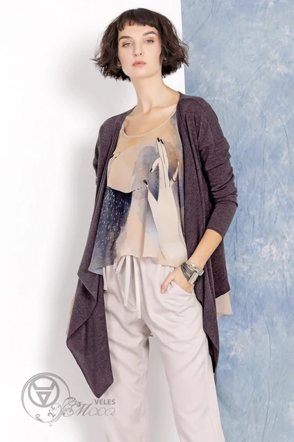 Прямоугольный бокс-кардиган длиной до середины бедра. Выполнен из мягкого тонкого трикотажного полотна, красиво драпирующего силуэт. Край по переду сырой (не обработан) Выглядит очень лаконично и стильно.Такие кардиганы отлично сочетаются с короткими юбками, длинными платьями, узкими футболками и джинсами.