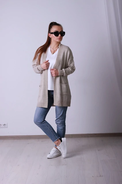 Стильный базовый кардиган прямого силуэта связан гладким переплетением из шерстяной пряжи. Очень уютный и мягкий! По краю борта вплетена металлизированная нить, которая придает особый шарм данному кардигану. Особенности - спущенный рукав и притачные карманы с обеих сторон кардигана. Носи весной с высокими джинсами, брюками или кожаными штанами. Этот кардиган будет твоим любимым!