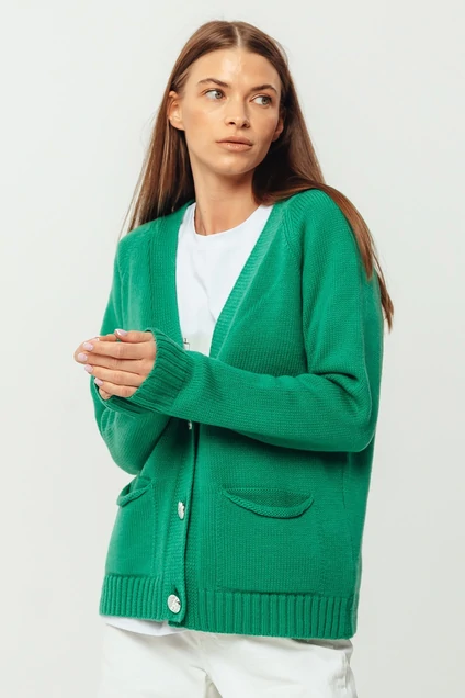 Женский трикотажный жакет из мягкого материала. Изготовлен из высококачественной дышащей пряжи, выполнен переплетением "кулирная гладь", очень мягкий и приятный к телу. Свободный и эргономичный крой. Базовая модель с втачными прямыми рукавами для повседневной носки. Длина жакета до середины бедра, V-образный неглубокий вырез, рукав-реглан, накладные карманы, пуговицы. Жакет прост в уходе, после стирки не линяет. Носи его в офис, а также на встречу с друзьями. Этот уютный и мягкий джемпер, будет прекрасно сочетается с брюками-палаццо, платьями и джинсами.