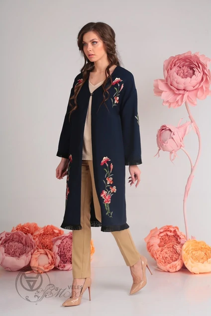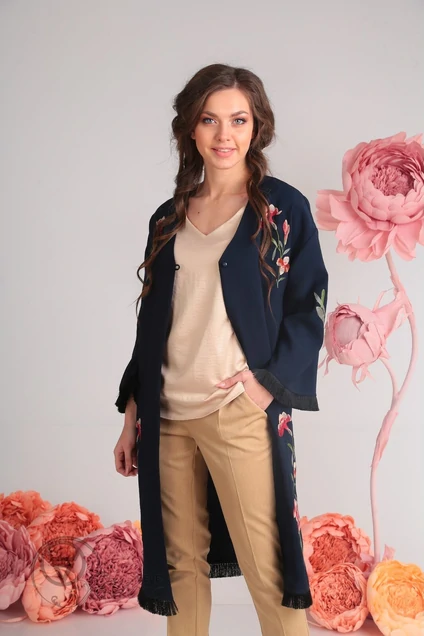 Удлиненный шазюбль прямого силуэта с расширенными к низу рукавами. Выполнен из плательного струящегося вискозного полотна. Изделие декорировано вышивкой: крупные красивые цветы, выполненные в реалистичной стилистике. Низы изделия и рукавов обрамлены густой бахромой цвета основной ткани. Шазюбль повседневного назначения для прохладного летнего вечера. Однако данное изделие может создать и нарядный образ или завершить стильный лук.