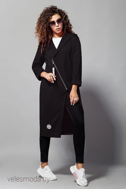 Кардиган 5002s-1 чёрный, свободного кроя, со спущенной линией плеча, капюшоном и карманами в боковых швах. Рукава длинные с отворотом. По спинке средний шов. Полочки переда ассиметрично расходятся к низу. Изделие застёгивается на застёжку – молнию. Длина рукава 49 см.