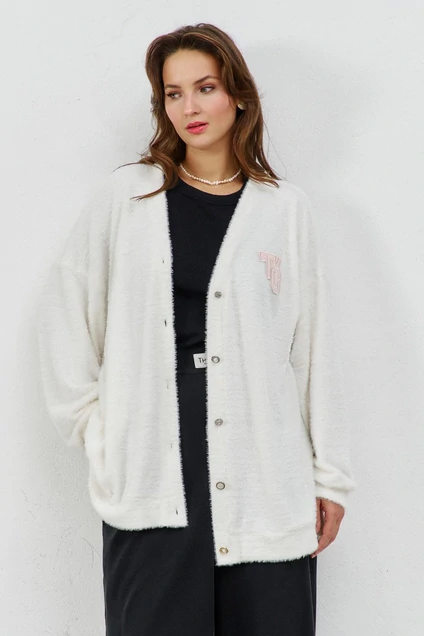 Кардиган нарядный из трендового мягкого трикотажа с вискозой оверсайз силуэта. Перед с обьемной вышивкой-лого. Застежка на оригинальные металлические пуговицы.