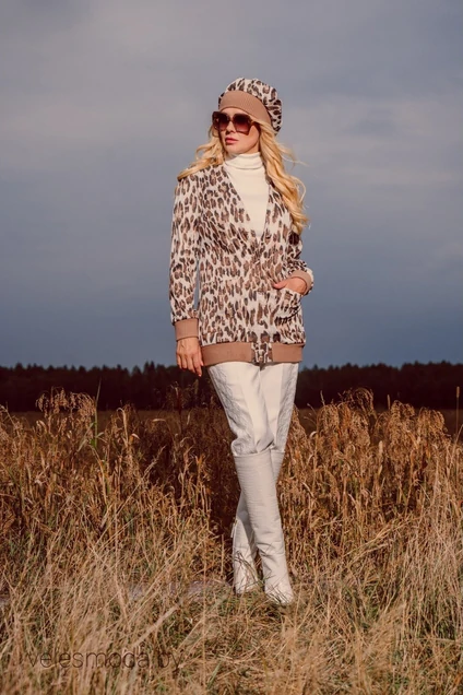 Кардиган прямого силуэта, выполнен из трикотажного полотна, по низу трикотажный довяз 6 см. Спереди застёжка на петли и пуговицы, накладные карманы. Рукав втачной, по низу трикотажный довяз 6 см. Кардиган декорирован пришивным логотипом VL по карману. Длина 74, рукав 60.