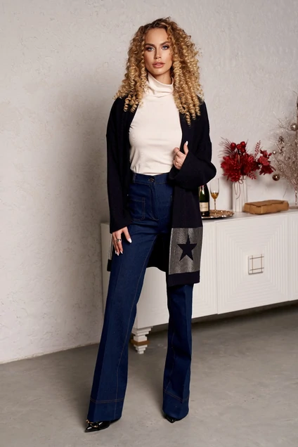 Кардиган прямого силуэта, со спущенной линией плеча, выполнен из трикотажного полотна.Перед распашной, без застежки.По низу переда и спинки нанесена декоративная печать.Рукав прямой, длинный.