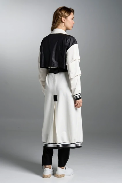Кардиган свободного покроя со спущенной линией плеча.Застежка центральная двубортная на кнопки.Воротник отложной пиджачного типа.Спинка и полочки с отлетными кокетками из отделочной ткани.Рукав со складками в верхнем шве.Спинка со встречной складкой ниже уровня бедер.Карманы в боковых швах.Низ рукава и кардигана обработан отделочным довязом.Навесной пояс и боковые шлевки выполнены из репсовой тесьмы.В навесной пояс вставлены полукольца.