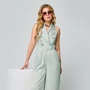 Элегантный женский комбинезон мятно-зеленого цвета идеально подходит для современной гардеробной коллекции. Модель прямого силуэта с воротником пиджачного типа и двубортной застежкой на пуговицы подчеркивает изысканность наряда. Широкие брюки обеспечивают комфорт и свободу движения, а боковые карманы добавляют практичности. Этот комбинезон — идеальный выбор для офиса или вечернего мероприятия, сочетая в себе стиль и функциональность.