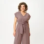 Комбинезон прямого, свободного силуэта, выполнен из однотонной ткани. Полочка комбинезона с V-образной горловиной и застежкой в среднем шве на потайную молнию. Спинка со средним швом. Рукав короткий, цельнокроеный. В области бедер в боковых швах обработаны прорезные карманы. По талии комбинезон фиксируется поясом “кушак”. В нижней части комбинезна половинки брюк широкие, типа “палаццо“.