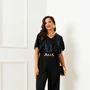 Справа верхняя передняя половинка разрезная по центру: от уровня бедер до низа обработан разрез, из-под которого выглядывает внутренняя отделочная деталь из шифона. Левая половинка брюк комбинезона цельная. Сзади по брюкам комбинезона от пояса расположены вытачки.