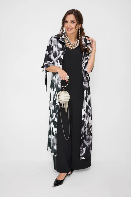 Комплект женский, состоящий из комбинезона и шазюбля. Комбинезон прямого силуэта. Вырез горловины по переду и спинке V-образный. Застежка в среднем шве спинки на потайную молнию. В боковых швах карманы. Шазюбль прямого силуэта. Состоит из трех видов ткани. Застежка на петли и пуговицы на планке. Воротник рубашечного типа. Рукав втачной, заканчивается манжетой с завязками. По спинке кокетка. Нижняя часть спинки выполнена из сетки. В боковых швах высокие разрезы и хлястики, которые помогают регулировать прилегание.