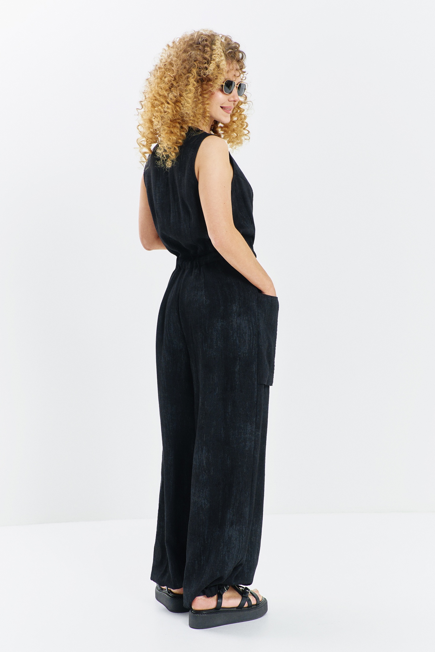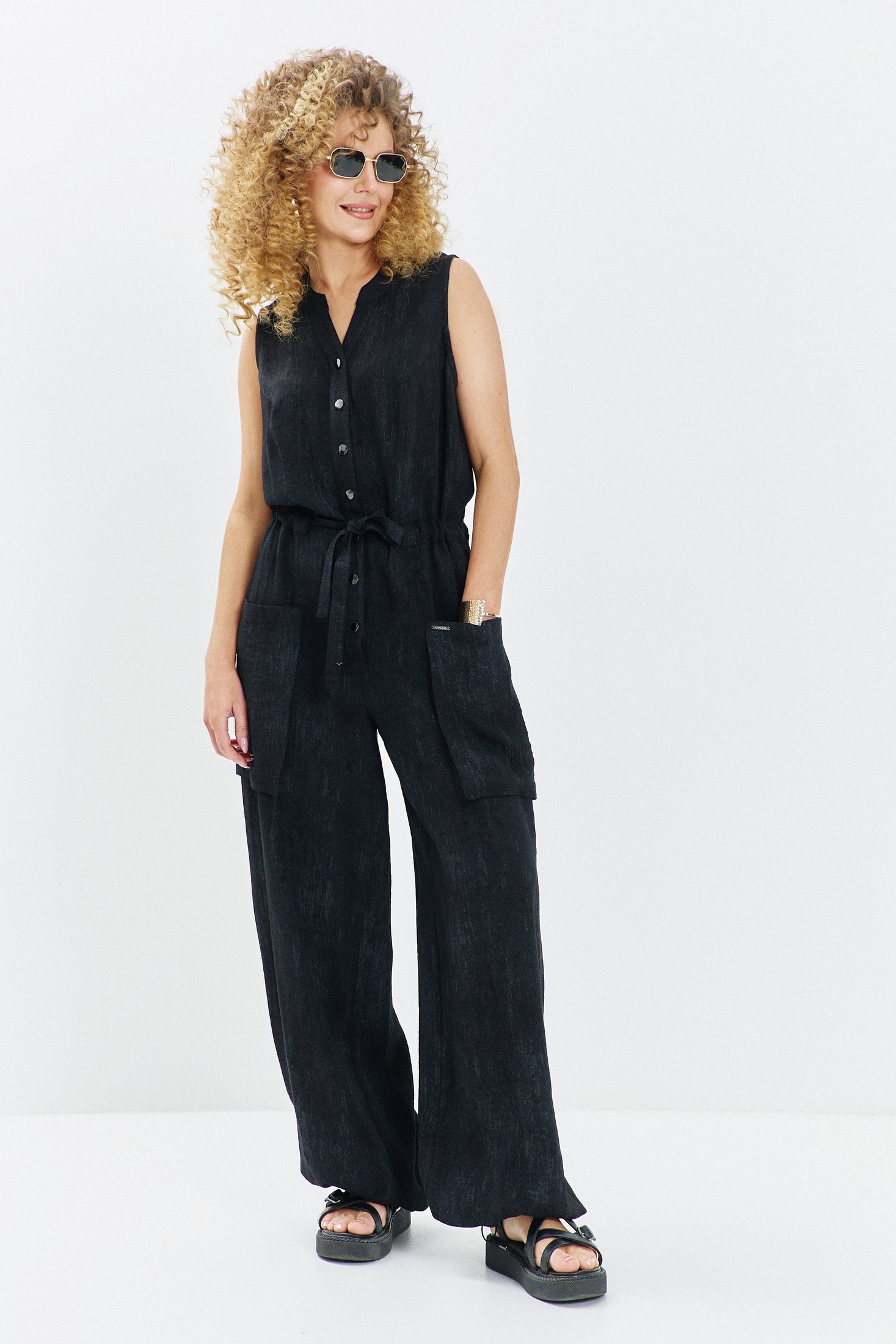 Комбинезон 717 черный меланж Euro Moda. Коллекция бренда Euro Moda представляет стильный летний комбинезон свободного кроя, выполненный из фактурного вискозного полотна. Благородный черный меланж создаёт эффектный объем цвета. Модель оверсайз не стесняет движений, предоставляя полную свободу. Застежка на кнопки визуально вытягивает силуэт, добавляя динамики и стройности. Удобные накладные карманы на брючинах привносят урбанистический акцент, а декоративные хлястики подчеркивают стиль милитари. Затягивающиеся на резинку штанины позволяют варьировать образ между классическим и casual. Идеально подходит для летнего сезона, обеспечивая комфорт и прохладу благодаря приятному к телу натуральному материалу.