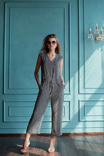 Комбинезон-бермуды из вискозы прямого кроя. Комбинезон отрезной по приспущенной линии талии, на кулиске. Пройма слегка спущена, по лифу переда нагрудные вытачки, в боковых швах бермуд карманы. Застежка в среднем шве спинки на две петли навесных и две пуговицы. Длина изделия по спинке/ Длина изделия по переду/ Длина рукава, см 42-44 р-р 46-50 р-р 52-56 р-р 138/-/- 139/-/- 140/-/- -