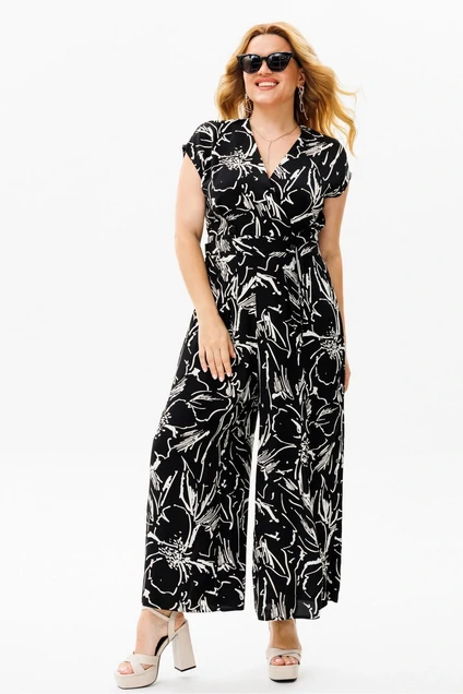 Комбинезон женский, свободного силуэта, со спущенной линией плеча, с втачным поясом на уровне линии талии, с застежкой на потайную тесьму-молнию в левом боковом шве, с поясом, который по переду крепится на 2 пуговицы, по спинке протянут через 2 шлевки. Лиф детали переда комбинезона с запахом, на уровне талии обработаны 2 складки на лицо. На нижней части по шву притачивания пояса обработаны по одной складке на каждой половинке. Лиф детали спинки комбинезона со средним швом, вверху которого обработан разрез с застежкой на 1 навесную петлю и пуговицу, с талиевыми вытачками. На нижней части по шву притачивания пояса обработаны по одной вытачке на каждой половинке. В боковых швах обработаны карманы, и шлицы, на которых с каждой стороны прикреплены по 3 пуговицы. Вырез горловины комбинезона «V-образной» формы, обработан обтачкой.Длина спинки – 123см.