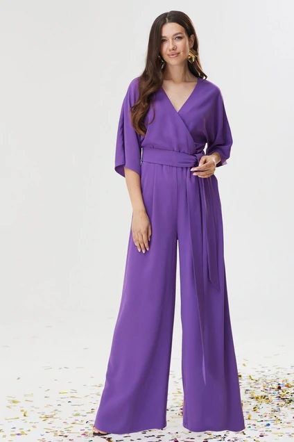 Нарядный комбинезон полуприлегающего силуэта с расширенными книзу брюками из струящейся ткани. Комбинезон отрезной по линии талии на резинке, верхняя часть комбинезона на запах. Рукав цельнокроеный длиной до локтя. По спинке V-образный вырез, в среднем шве центральная застежка на потайную молнию. В боковых швах карманы. В комплект входит пояс из основной ткани. Длина изделия: 157 см