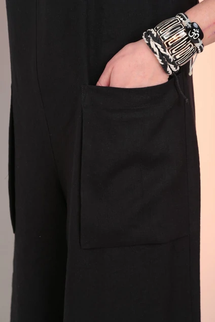 Комбинезон полуприлегающего силуэта. В верхней части спинки запах. На передней половинке накладные карманы с отлетными краями. Длина от проймы до низа по боковому шву 105