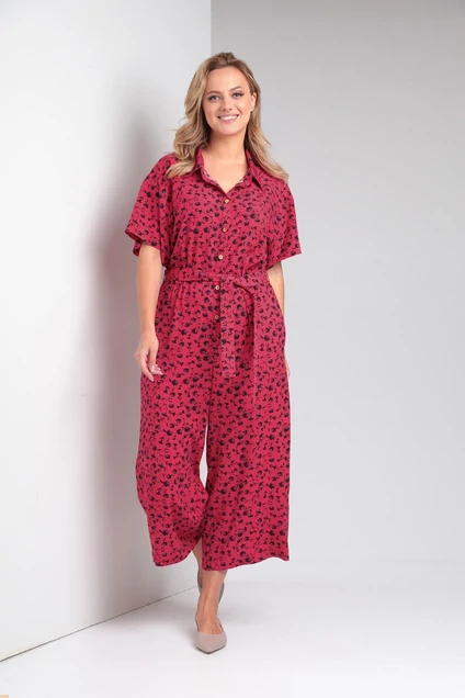 Комбинезон женский свободного покроя их штапельной ткани с принтом. По переду центральная застежка рубашечного типа на петли и пуговицы. По спинке отлетная кокетка. По талии переда и спинки кулиса с резинкой. Рукав короткий, линия плеча спущена. В боковых швах функциональные карманы. Воротник рубашечный на стойке. В комплекте сьемный мягкий пояс из основной ткани.