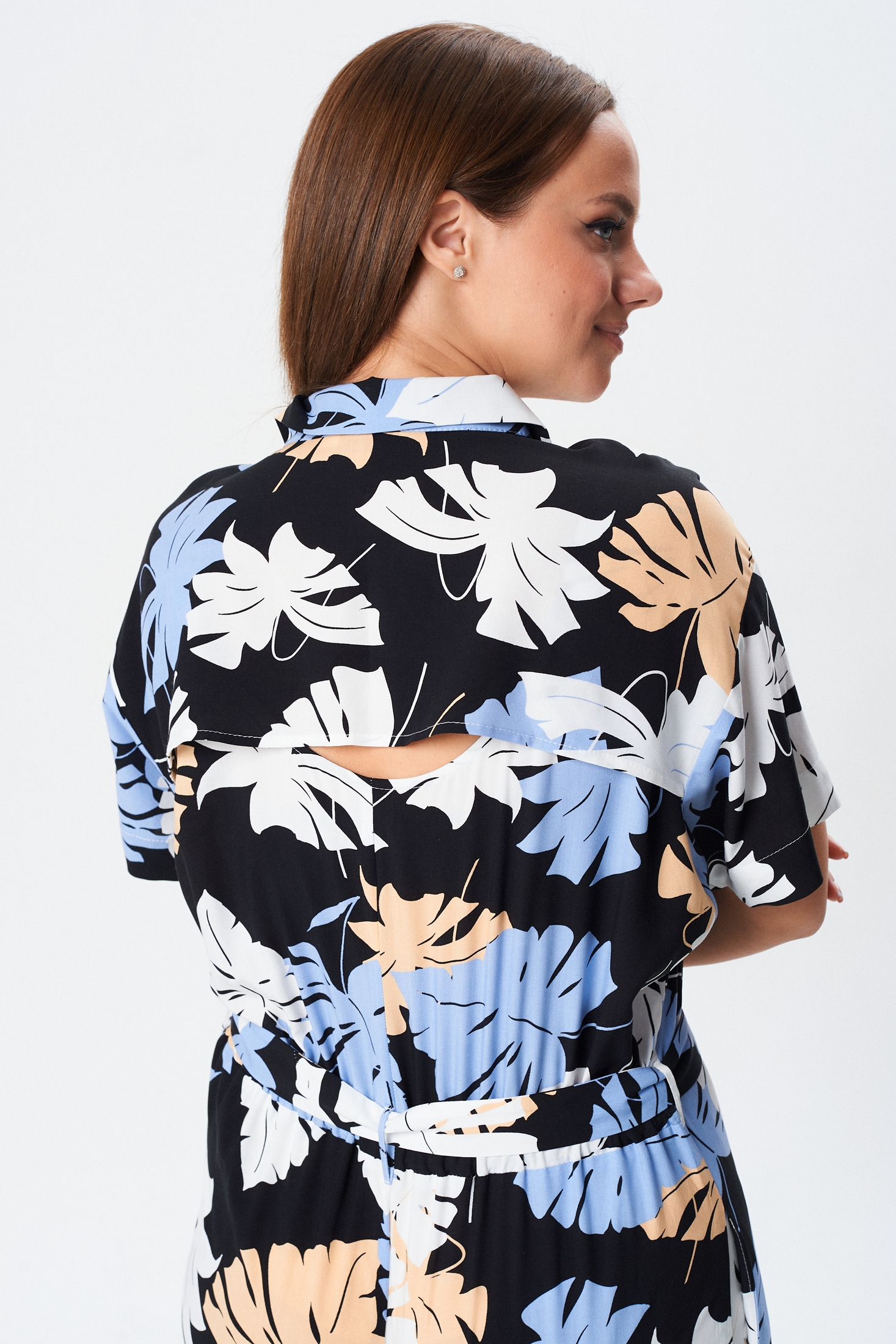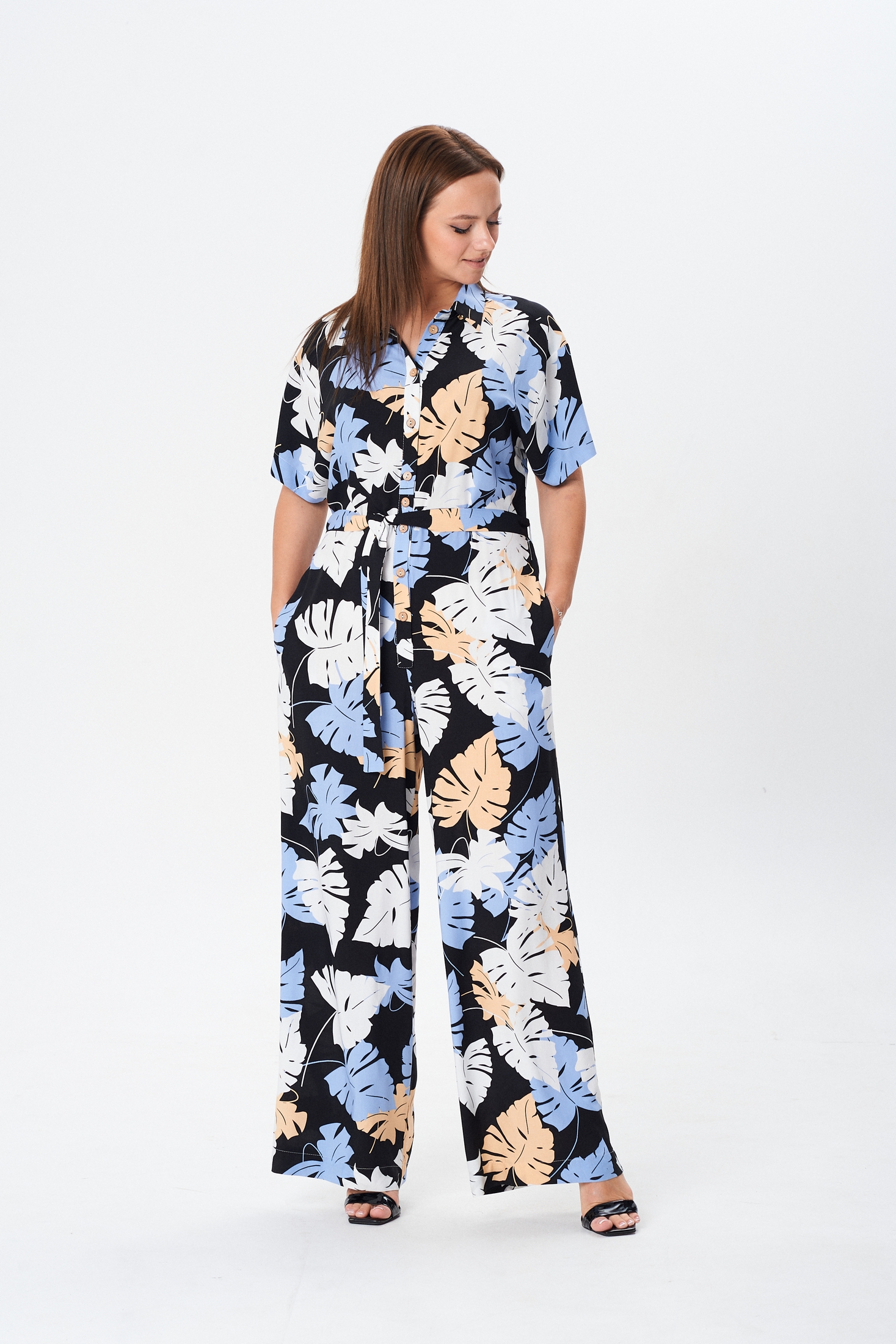 Комбинезон женский свободного покроя их штапельной ткани с принтом. По переду центральная застежка рубашечного типа на петли и пуговицы. По спинке отлетная кокетка. По талии переда и спинки кулиса с резинкой. Рукав короткий, линия плеча спущена. В боковых швах функциональные карманы. Воротник рубашечный на стойке. В комплекте сьемный мягкий пояс из основной ткани.