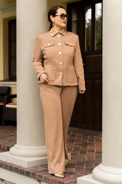 Костюм состоит из жакет на подкладке и брюк, из трикотажа шикарного бежевого цвета. Безусловная классика современная и всегда привлекает взгляды.Жакет прямого кроя, с круглым вырезом горловины . Жакет с центральной бортовой застёжкой на петли и пуговицы. На полочках обработаны накладные карманы и клапаны, жакет с плечевыми накладками. Брюки женские прямого силуэта, по переду пояс, по спинке пояс с эластичной резинкой. Брюки с боковыми карманами. Брюки со швом по переду, визуально вытягивающий силуэт.