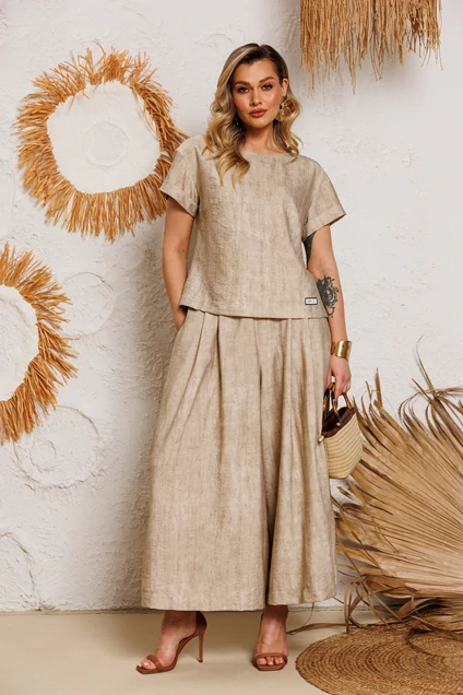 Стильный женский комплект, состоит из блузы и брюк-юбки. Блуза прямого силуэта, выполнена из вискозной ткани с добавлением хлопка с эффектом жатки, что придаёт изделию особый стиль. Блуза с нагрудными выточками, спущенным рукавом с манжетой, по бокам с небольшими разрезами (разрез 9 см). Перед блузки декорирован пришивной дизайнерской нашивкой. Брюки юбка прямые, со складками по переду и спинке, выполнены из вискозной ткани с добавлением хлопка с эффектом жатки. Брюки-юбка на поясе, по бокам с резинкой, по спинке с застежкой на потайную молнию и пуговицу.