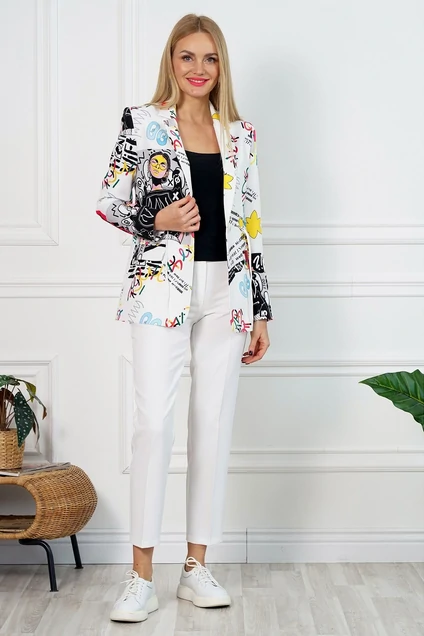 Комплект женский 3-х предметный состоит из жакета, топа и брюк. Жакет прямого силуэта, частично на подкладке (перед и спинка), с центральной застёжкой на петлю и пуговицу, по линии талии кулиса с отделочным шнуром с фиксаторами, фиксируемый степень прилегания.