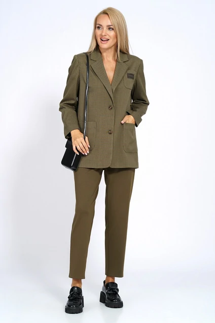 Жакет прямого силуэта, перед на подкладке, с застёжкой на петли пуговицы. Декорирован нашивками по верхнему карману и понизу спинки. Перед с верхним и нижними накладными карманами. Спинка с отлетной кокеткой с разрезом, понизу с притачным поясом. Рукава втачные, двухшовные, длинные, в локтевом шве шлица с пришивными пуговицами. Воротник пиджачного типа. Брюки трикотажное полотно 68%вискоза, 30%нейлон, 2%спандекс