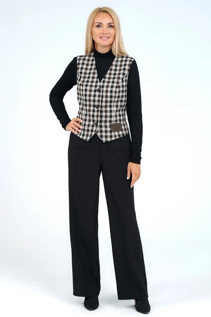 Жилет полуприлегающего силуэта, частично (перед) на подкладке, застёжкой на петли и пуговицы, с фигурной линией низа. Перед с рельефными швами. Спинка с рельефными швами и средним швом. Декорирован нашивками по переду и спинке.