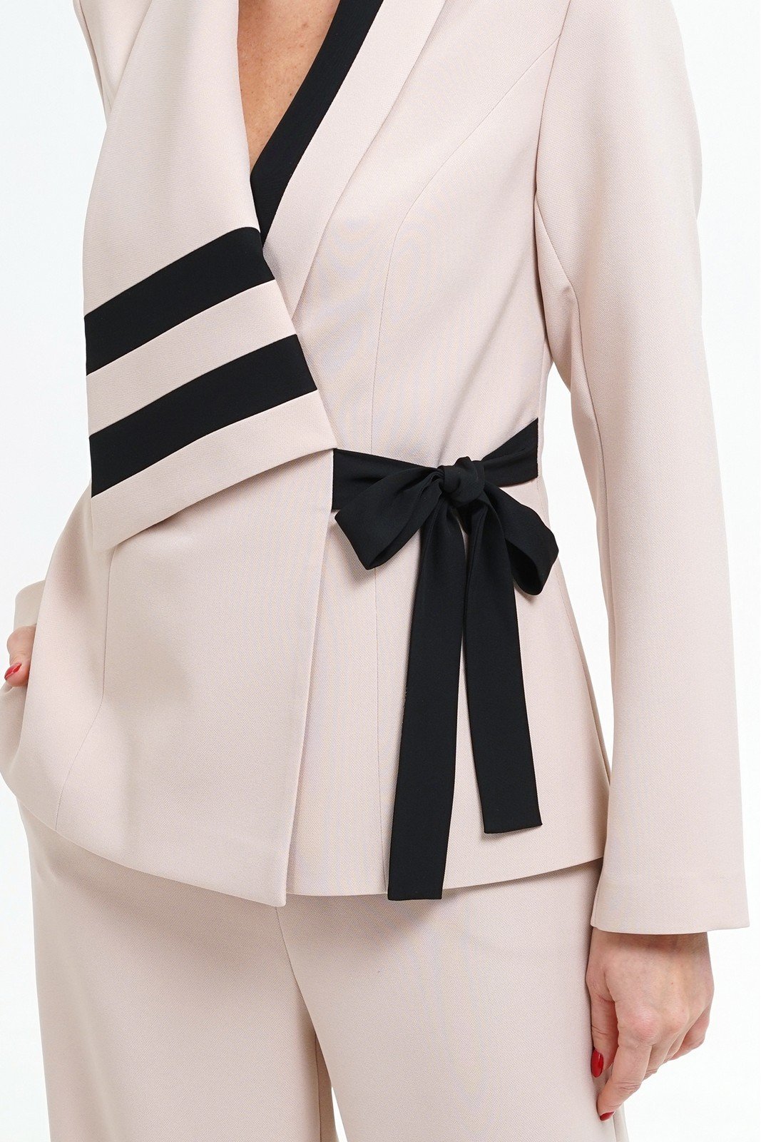 Жакет полуприлегающего силуэта, частично на подкладке (перед), с двух-бортной застёжкой с завязывающимся поясом (выполнении из отделочной ткани) и с внутренней застёжкой на петлю и пуговицу.