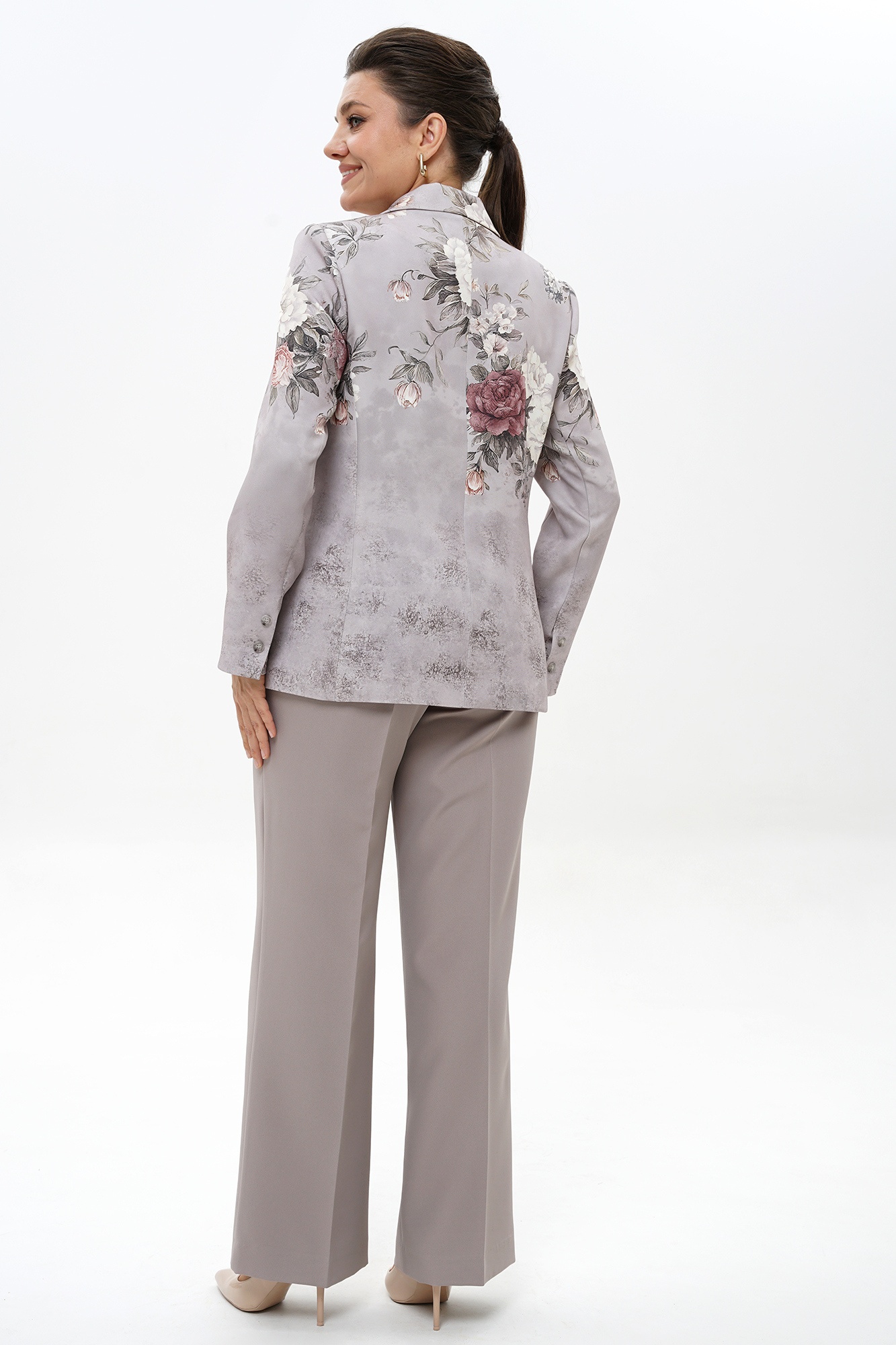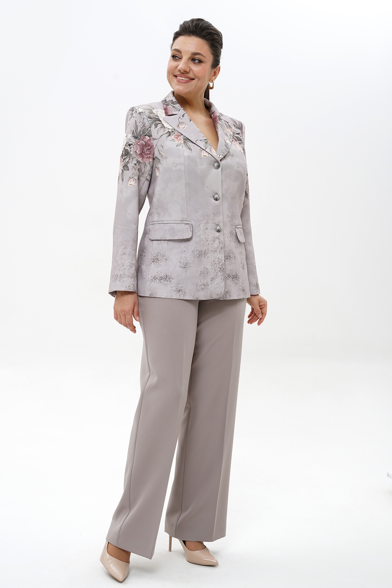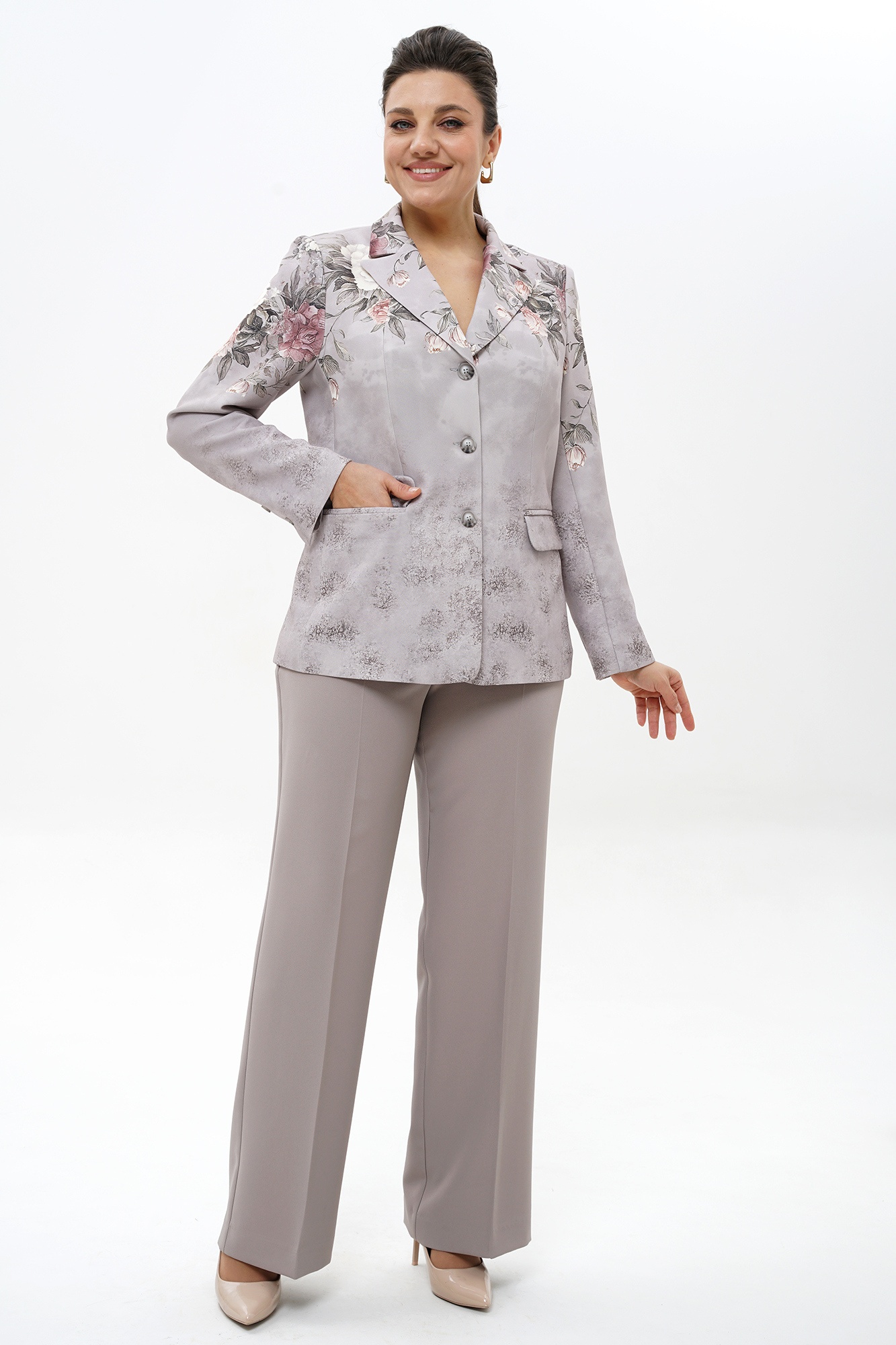 Костюм брючный 2492 серый ALANI впечатляет своим стильным дизайном и практичностью. Коллекция бренда ALANI представляет двухпредметный комплект, состоящий из жакета и брюк, выполненный из комфортной вискозы с добавлением полиэстера и нейлона. Жакет полуприлегающего силуэта с отложными лацканами, рельефными швами и прорезными карманами придает образу элегантность и утонченность. Длинные втачные рукава украшены декоративными пуговицами. Прямые брюки со сгибом и застежкой на молнию и пуговицу обеспечивают удобную посадку. Серый цвет и цветочный рисунок делают костюм универсальным для офисного и праздничного стиля, идеально подходящим для весенне-летнего сезона.