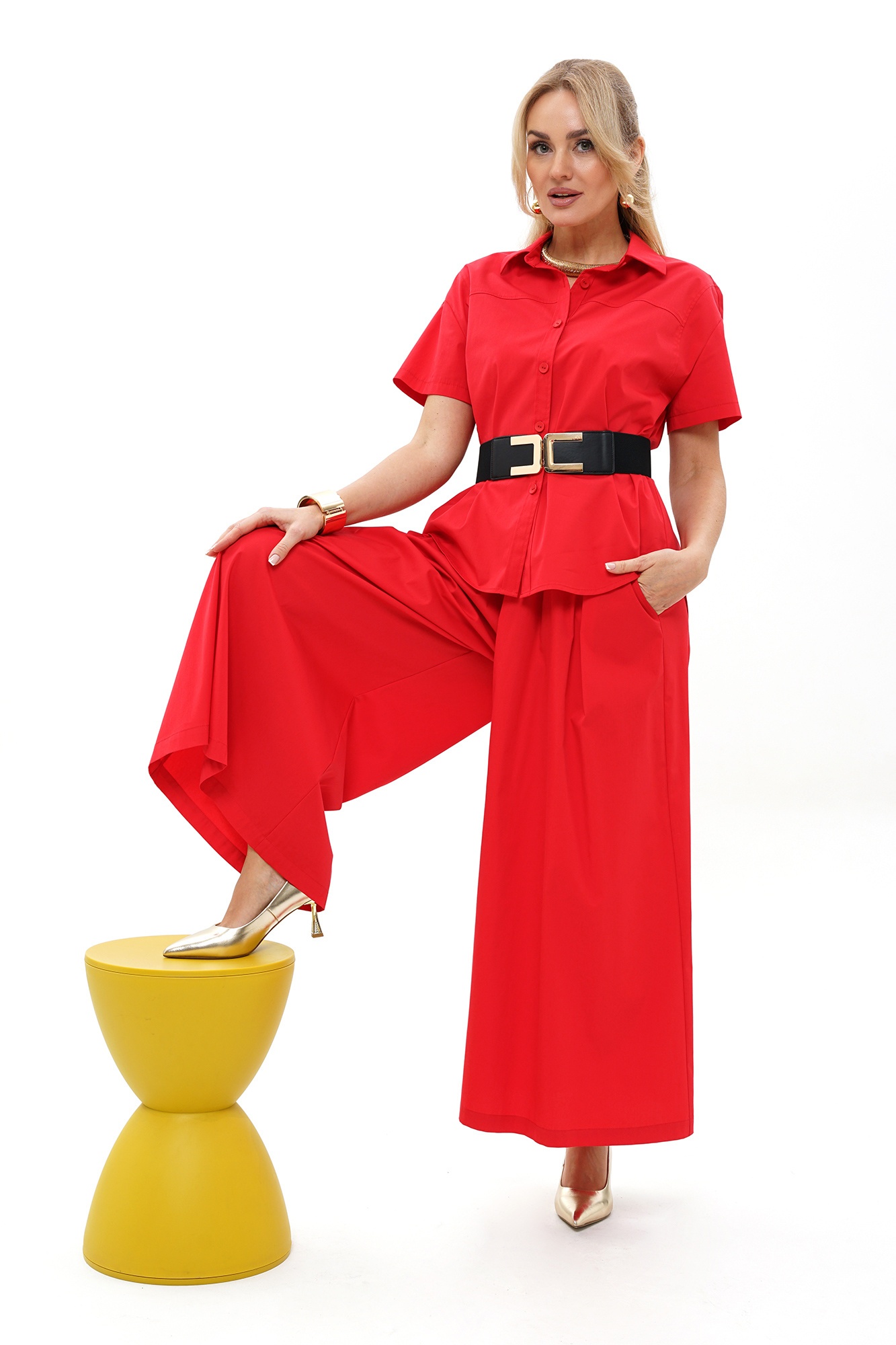 Костюм брючный 2494 красный ALANI сочетает в себе стиль и комфорт. Коллекция бренда ALANI предлагает изящный комплект из двух предметов: блузка и юбка-брюки. Блузка прямого силуэта выполнена с пуговичной застёжкой, дополнена поясом для акцента на талии. Свободная юбка-брюки с эластичным поясом и боковыми карманами обеспечивает удобство в ношении. Хлопковая ткань с добавлением спандекса благоприятна для любого движения. Короткие рукава и воздушный силуэт делают этот костюм идеальным для летних дней. Яркий красный цвет добавляет выразительность образу, а стильный фасон подчёркивает современный городской стиль.