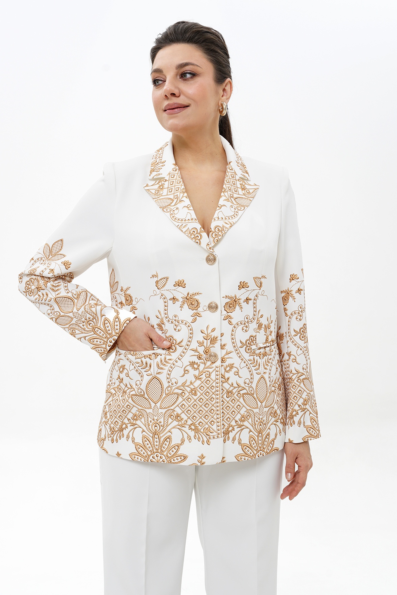 Костюм брючный 2496 молоко + золото ALANI — это выбор современной женщины, стремящейся к стильной индивидуальности. Коллекция бренда ALANI предлагает комплект из жакета и брюк, выполненный из ткани, сочетающей вискозу и полиэстер. Полуприлегающий силуэт жакета с отложными лацканами и рельефными швами подчёркивает элегантность образа, а прорезные карманы добавляют практичности. Брюки прямого силуэта создают актуальный и утончённый вид. Молочного цвета костюм с золотыми элементами подходит для любого сезона, позволяя чувствовать себя уверенно и комфортно как на прогулке, так и в офисе. Это идеальный выбор для делового и стильного гардероба.