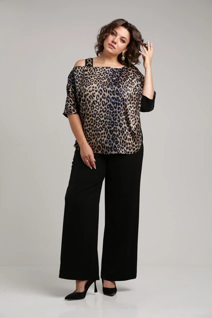 Костюм женский, состоящий из блузки и брюк. Блузка прямого силуэта с цельнокроенными рукавами и асимметричным вырезом горловины , открывающим правое плечо с втачной деталью на плече с металлическим украшением Блузка выполнена из двух видов ткани. Брюки широкие с боковыми карманами и притачном поясе с резинкой.