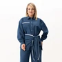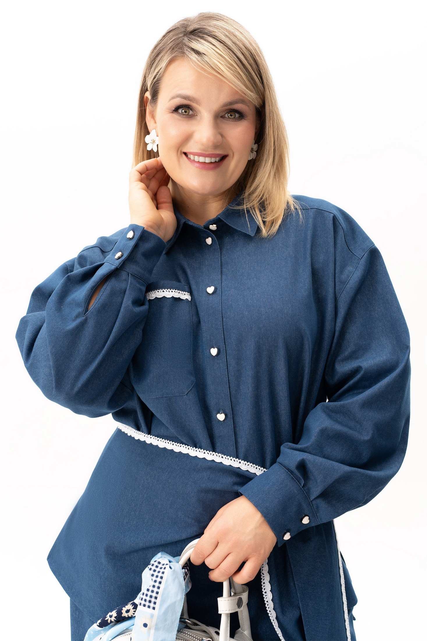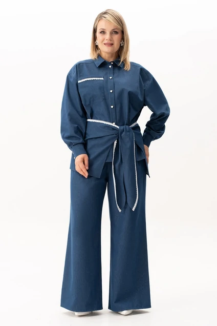Костюм брючный 4153 Algranda (Новелла Шарм) — это стильный способ дополнить ваш гардероб. Коллекция бренда Algranda предлагает джинсовый костюм-двойку из хлопка с эластаном, обеспечивающим комфортную посадку. Темно-синий деним классично комбинируется с модной детализацией: долгие втачные рукава на манжетах, контрастные пуговицы в форме сердца и съемная баска-косынка. Брюки палаццо с высокой посадкой и эластичным поясом добавляют свободу движений и визуально удлиняют фигуру. Этот костюм подходит для повседневного стиля casual, прогулок и нестрогих офисных встреч. Длина жакета — 69 см, длина брюк — 112 см, а длина рукава — 61 см. Темно-синий цвет сочетается с белой кружевной отделкой, добавляя акцент в образ.