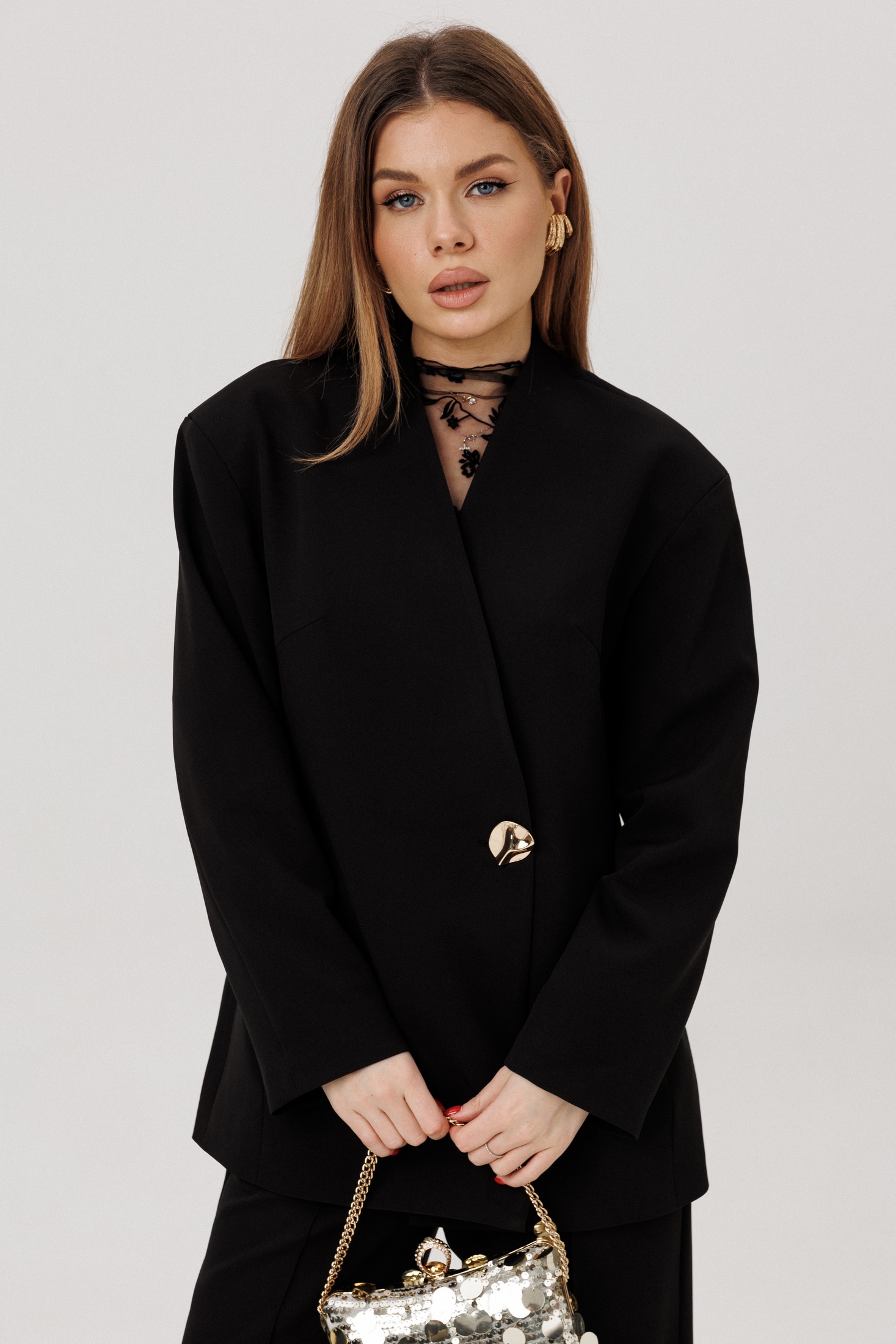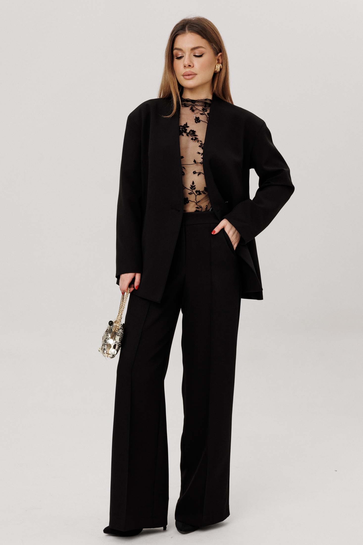 Костюм состоит из жакета и брюк, выполненных из качественной ткани. Жакет полуприлегающего силуэта обладает спущенными плечами и V-образным вырезом, что добавляет образу изысканности. Функциональные детали включают подкладку, втачные длинные рукава и действующие карманы в рельефах по переду. Застежка на петлю-пуговицу . Спинка жакета оформлена средним швом и рельефами для идеальной посадки. Брюки прямого силуэта дополняют ансамбль, предлагая комфорт и свободу движений. Они оснащены притачным поясом и удобной застежкой на тесьму-молнию спереди. Боковые карманы подчёркивают функциональность брюк