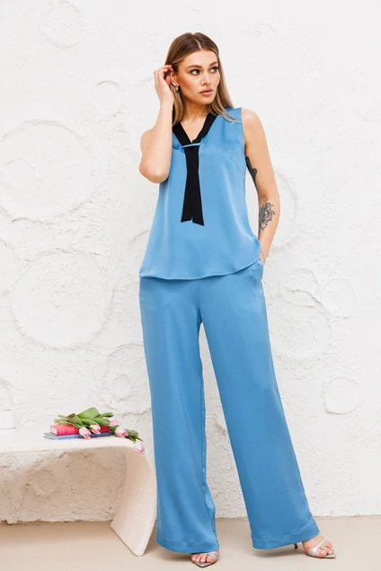 Костюм двухпредметный. Блузка прямого силуэта с фигурным низом.Вырез горловины v-образный.Из плечевого шва декоративный галстук из отделочной ткани.Брюки палаццо свободного кроя с притачным поясом на резинеке.В боковых шах прорезные карманы.