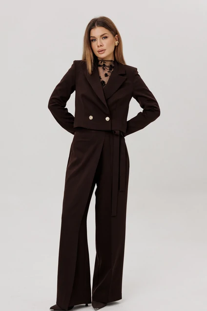 Костюм двухпредметный: состоящий из жакета и брюк. Жакет укороченный полуприлегающего силуэта. По переду нагрудная вытачка. Двухбортная застёжка на петли-пуговицы. Жакет на подкладке. Брюки прямого силуэта с имитацией запаха на притачном поясе. По переду застежка на тесьму-молнию. По боковым действующие карманы.