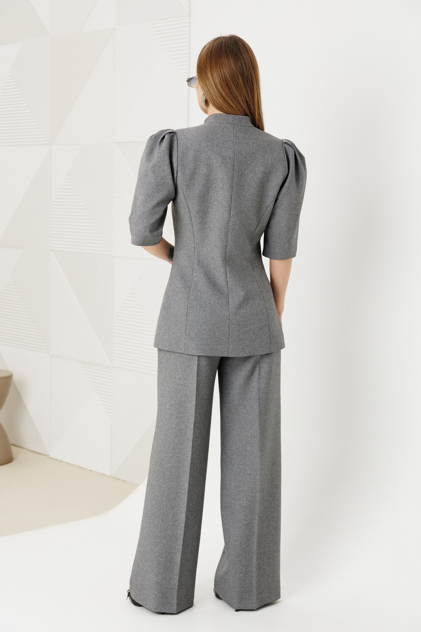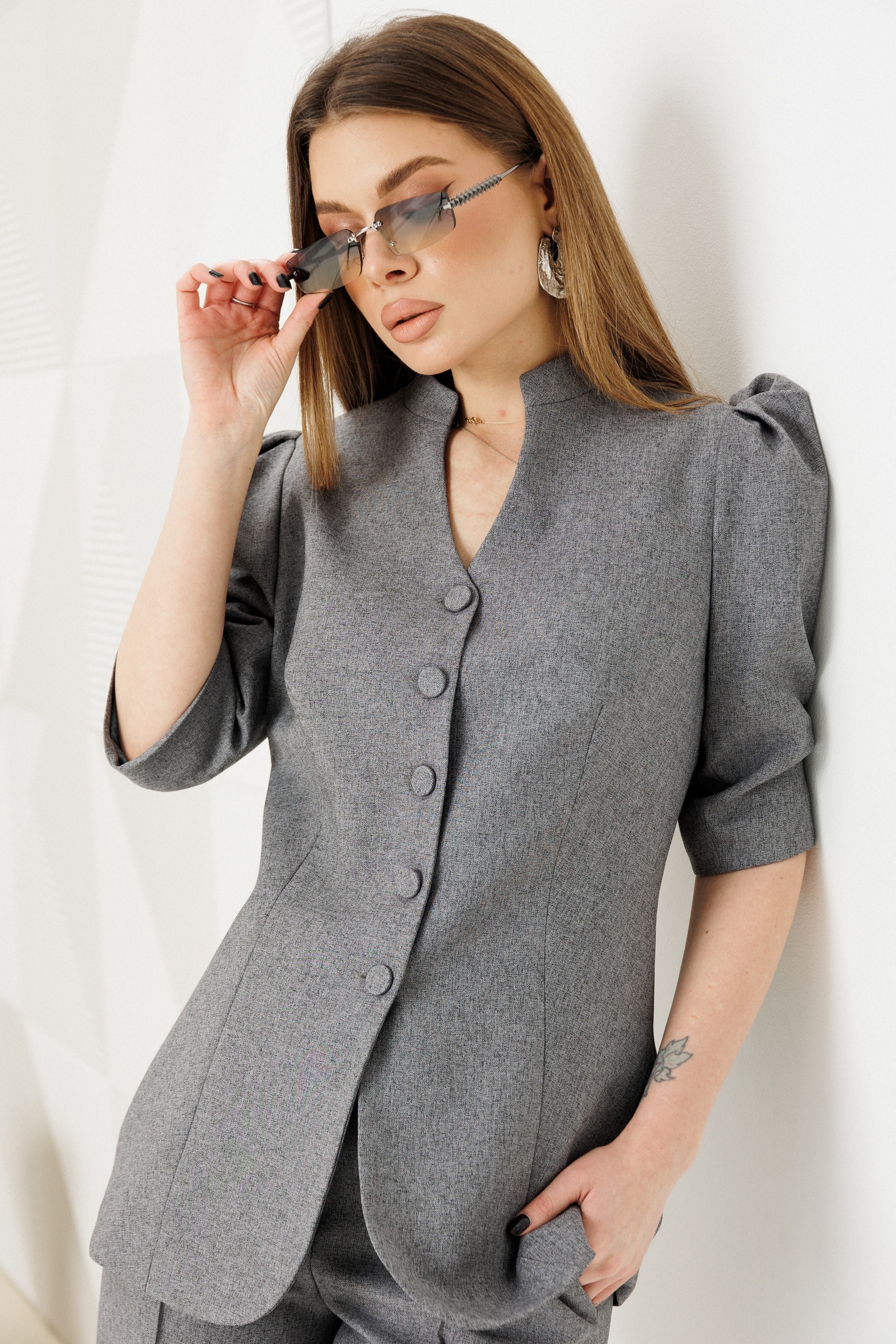 Костюм брючный 2149-1 серый Ambera style выполнен из костюмной ткани со смесовым составом, который включает полиэстер, вискозу и спандекс, что обеспечивает комфорт и легкость в носке. Коллекция бренда Ambera style предлагает приталенный жакет на подкладке с модными рукавами "фонарик", создающими утонченный шарм. Застежка на металлические пуговицы акцентирует внимание на стильном дизайне жакета. Прямые брюки с высокой посадкой и практичной застежкой на тесьму-молнию добавляют удобства, а функциональные боковые карманы обеспечивают дополнительное удобство. Серый цвет и классический стиль делают этот костюм идеальным выбором для офисных и повседневных образов в любом сезоне.