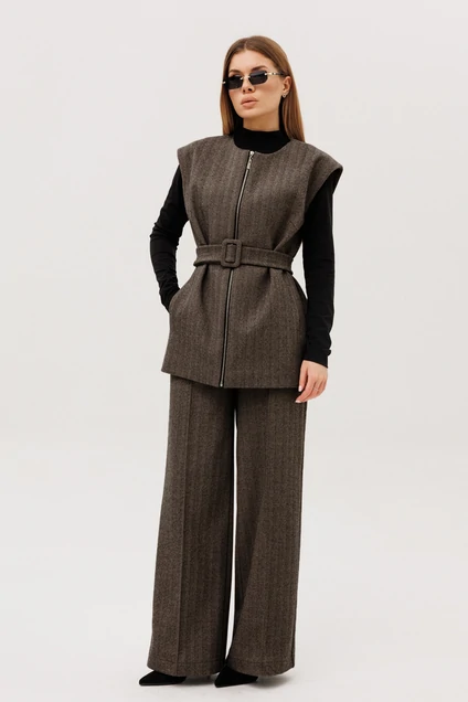 Костюм трехпредметный: Жилет женский свободного силуэта,с действующими карманами.По переду металлическая молния,пояс с пряжкой обтянутой из основной ткани.Элегантные женские брюки прямого кроя ,по переду на брючинах стрелки. Модель с высокой посадкой на притачном поясе обеспечивает идеальное прилегание. Спереди расположена практичная застежка на тесьму-молнию, добавляющая удобства при носке. Брюки укомплектованы функциональными боковыми карманами, что придает модели дополнительную практичность и удобство. Эта модель идеально подойдет как для офиса, так и для создания повседневных стильных образов.Джемпер женский прилегающего силуэта с втачным одношовным рукавом с воротником-стойкой.