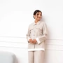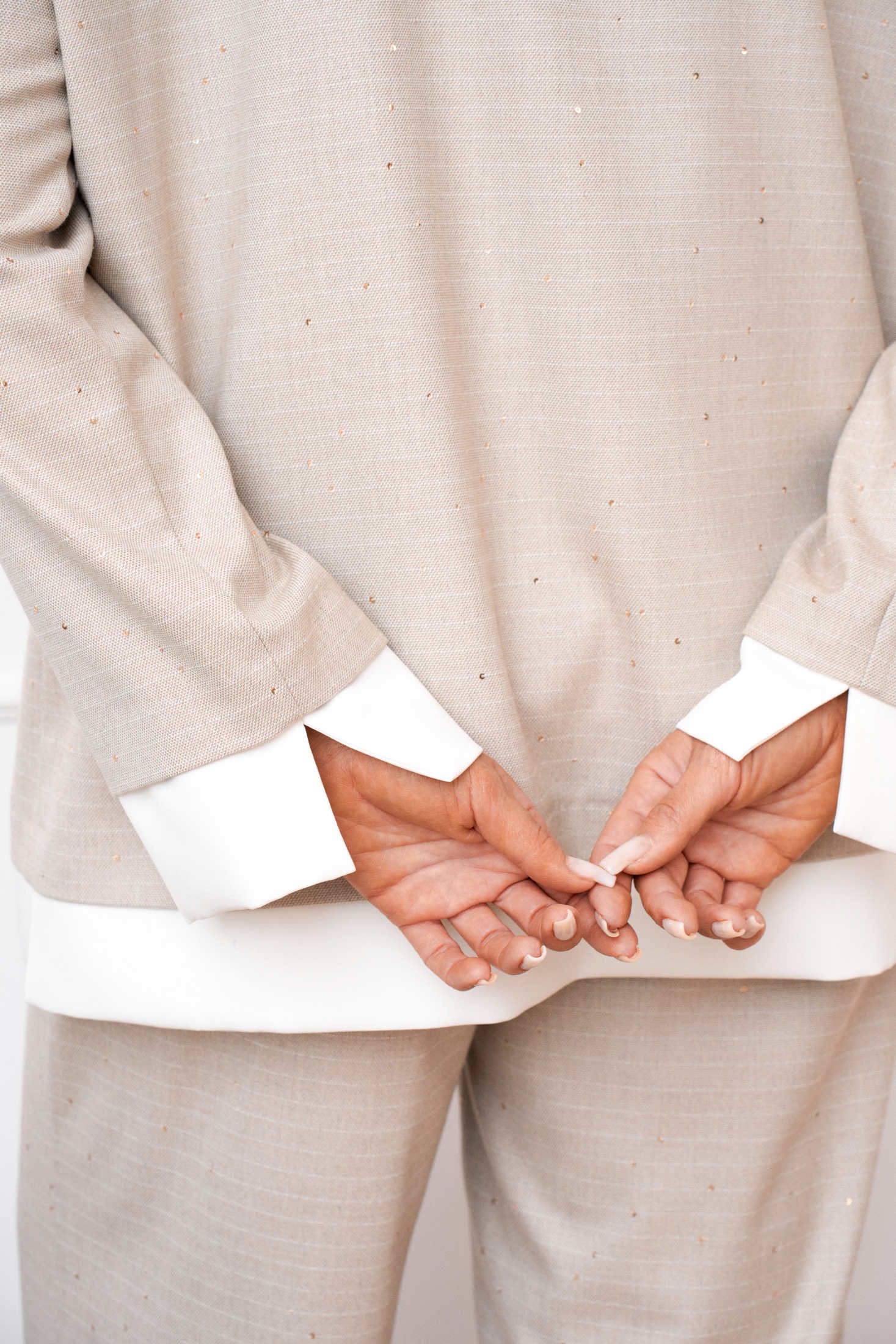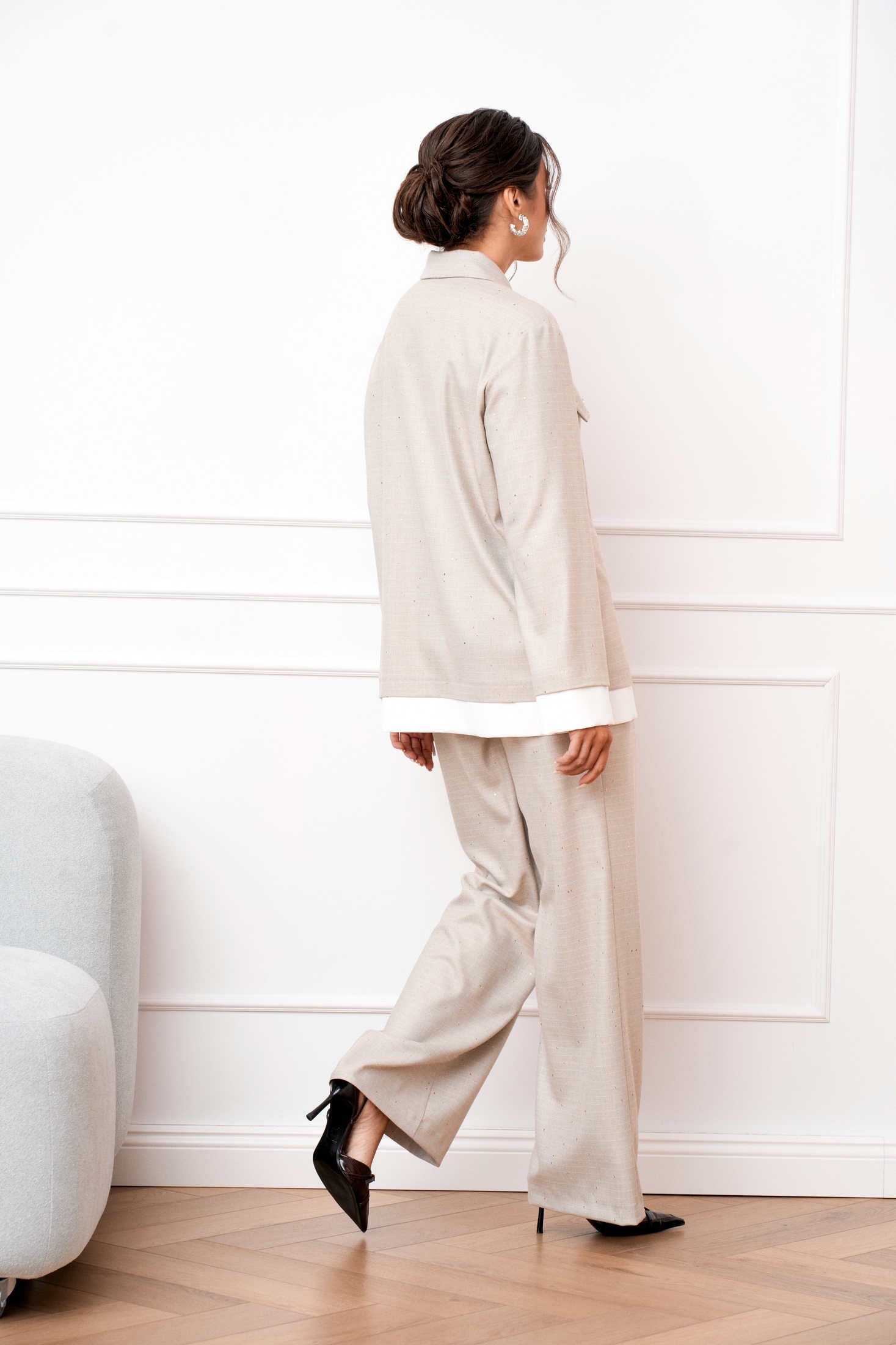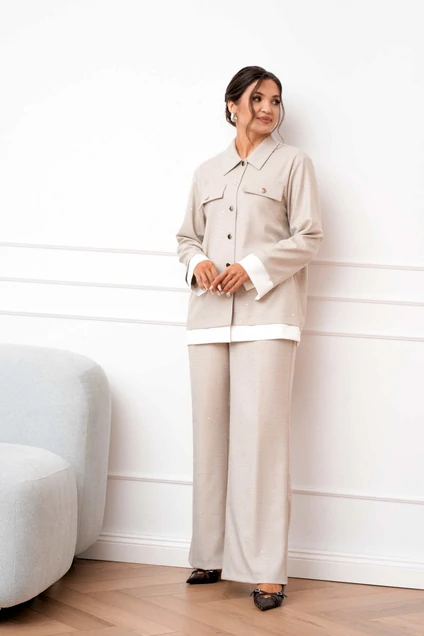 Костюм брючный 1074-1 AMUAR - это стильный комплект из коллекции бренда AMUAR, который идеально подходит для офисного гардероба. Изготовлен из костюмной ткани, сочетает вискозу и полиэстер, что обеспечивает комфорт и долговечность. Рубашка прямого силуэта с рубашечным воротником украшена настроченными клапанами, фиксирующимися пуговицами, и контрастной отделкой на подоле. Длинные втачные рукава и декоративные элементы подчеркивают уникальность дизайна. Брюки прямого силуэта дополнены боковыми карманами и поясом с резинкой на задней части для удобства посадки. Центральная застежка с молнией делает костюм функциональным и практичным. Бежевый цвет и классический фасон делают этот костюм универсальным выбором для любого сезона.